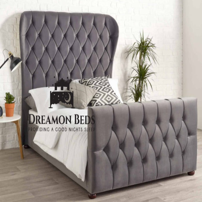 The Shanghai Wingback bed frame is crafted impeccably with a thickly padded headboard providing extra comfort and luxury. This bed frame is finished in exquisite Spanish upholstery by the finest trained artisans guaranteed to impress.