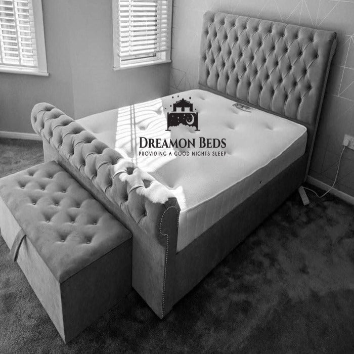 The Phoenix scroll sleigh bed frame is crafted impeccably with a thickly padded headboard providing extra comfort and luxury. This bed frame is finished in exquisite Spanish upholstery by the finest trained artisans guaranteed to impress.